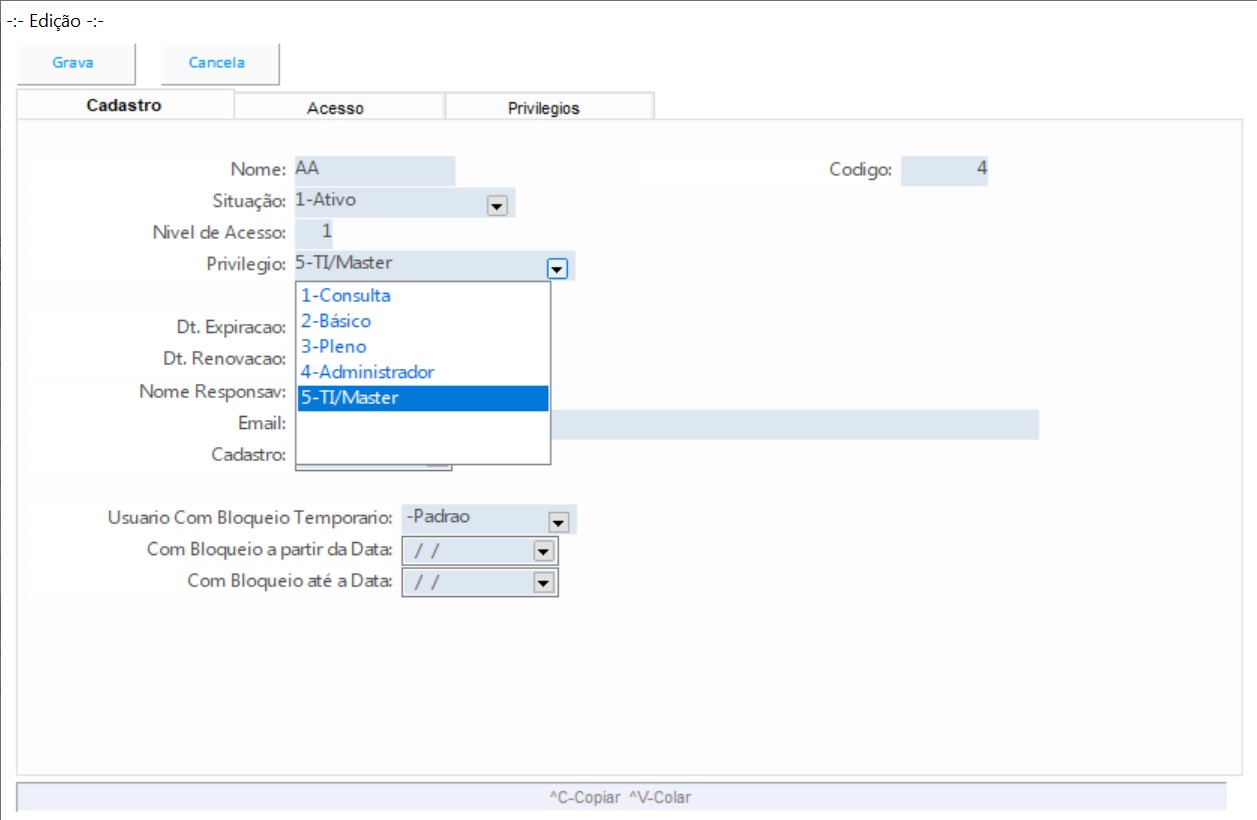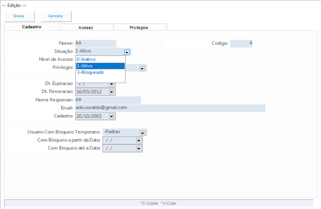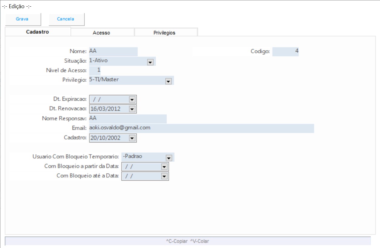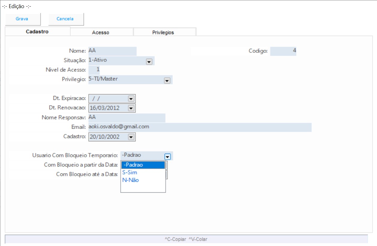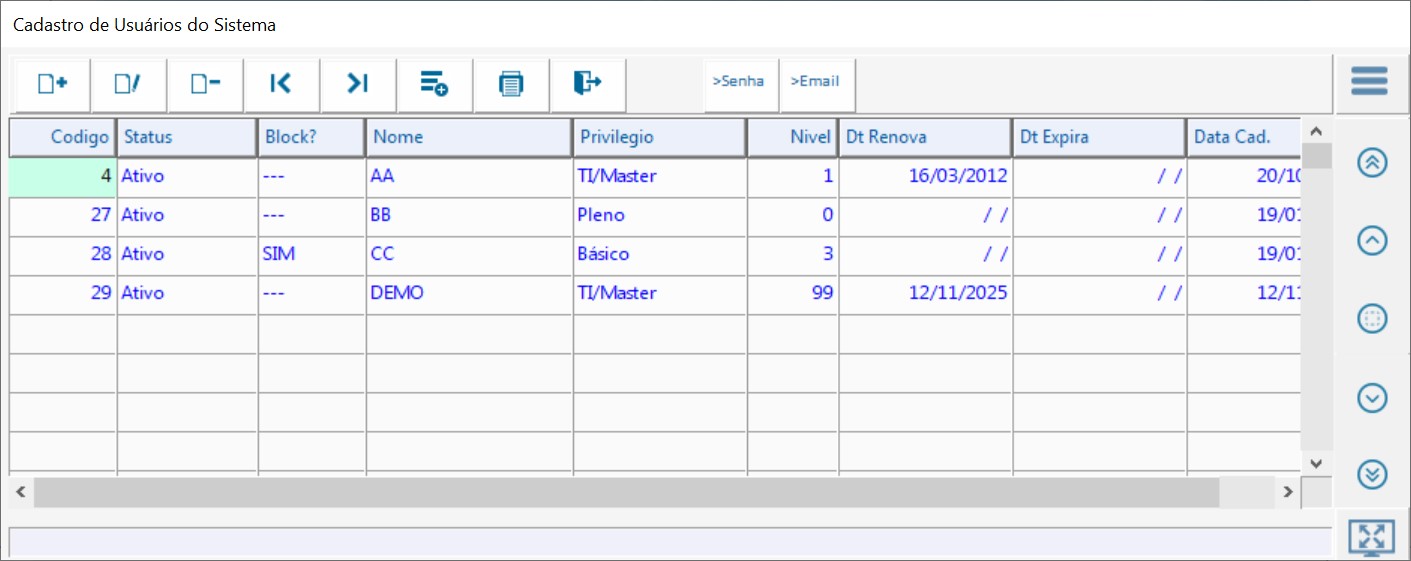 Cadastro de usuários do sistema